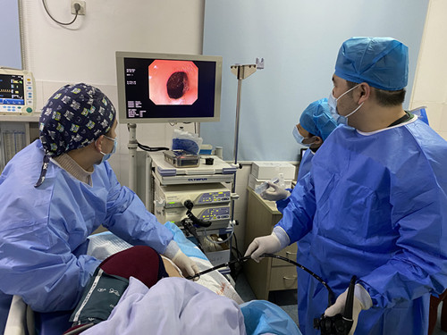 刘晓伟医生带领医护团队立即实施抢救,经患者家属同意,立即行急诊胃镜下止血治疗。进镜至食管胃贲门处见长约1.0cm纵行撕裂口,大量渗血,明确诊断为贲门撕裂大出血。诊断明确后,继续清除胃内积血,观察全胃排除其他出血点,随即予钛夹夹闭撕裂口,再冲洗创面,创面止血良好。术后患者安返病房。