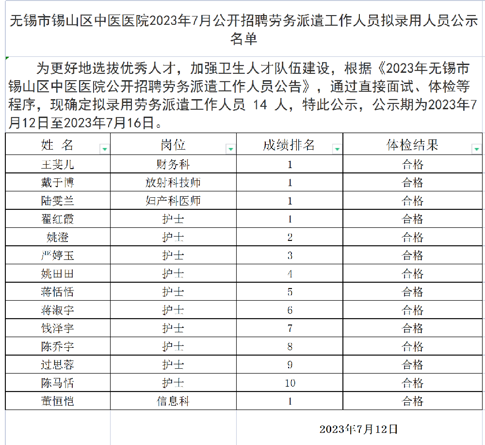 无锡市锡山区中医医院2023年7月公开招聘劳务派遣工作人员拟录用人员公示名单